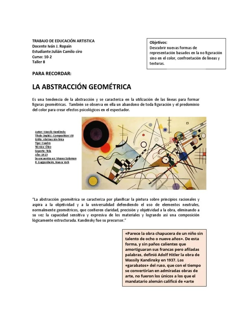 El arte abstracto, como tal, ya existía desde la prehistoria si tomamos las formas de arte de civilizaciones perdidas como el arte rupestre. Vassily kandinsky fue un pintor ruso considerado como pionero y teórico del arte abstracto. Podría decirse que kandinsky fue el inventor, el creador, el primero en pintar un cuadro totalmente abstracto, estilo poco comprendido y que tantos enemigos tiene. Kandinsky, creador del arte abstracto. La liberación del color y la fuerza de las formas geométricas, dan paso a las vanguardias de la pintura abstracta. El arte abstracto, como tal, ya existía desde la prehistoria si tomamos las formas de arte de civilizaciones perdidas como el arte rupestre. May 04, 2020 · clase del arte abstracto para la asignatura de artes visuales a distancia.. May 04, 2020 · clase del arte abstracto para la asignatura de artes visuales a distancia.